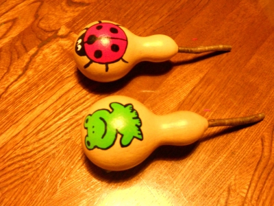 友達の双子の姪っ子の一歳のたんじょうびプレゼントのご依頼をいただき、ひょうたんマラカスをつくったよ。
