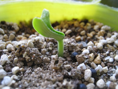 ひょうたんの芽が、やっとこさひょこひょこと出てきた。