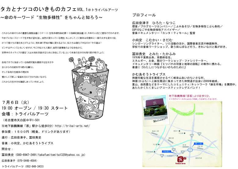 Home › MUSIC › COP10生物多様性条約 2010-07-06 COP10生物多様性条約 10月に愛知県にて開催される、生物多様性国際会議「COP10」にシンクロし、今晩、こんな集まりが名古屋トライバルアーツにて開祭されます。 我らが、かむあそうトライブスも参加。 生物多様性ってなんぞや?って方、何かピンと来た方は、是非遊びにきて、いろんな話をしましょう~。 この記事が気に入ったらいいね ! お願いします。シェアするツイートするTwitter で、ふたごや農園を Follow futagoya共有:クリックして Twitter で共有 (新しいウィンドウで開きます)Facebook で共有するにはクリックしてください (新しいウィンドウで開きます)クリックして Google+ で共有 (新しいウィンドウで開きます) 関連記事 Toti Soler i S?lvia P?rez Cruz: "Can?? de suburbi" 「かむあそう太陽音楽楽団」 「ONE LOVE」希望のメッセージ from かむあそうトライブス ONE EARTH 2010 PHOTO STREAMING 「のけもののけものとたわけもの」かむあそうトライブス sound of sleep ONE EARTH '10 PHOTO コメントを残す コメントをキャンセル